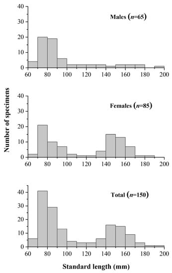 The standard length of all individuals ranged from 67 to 190 mm (mean length: 107.3 ± 35.6 mm), mainly distributed in the range of 70–100 mm and accounting for 55.33%, followed by 140–170 mm, accounting for 27.33%. The standard length of 65 males ranged from 68 to 190 mm (mean: 95.8 ± 31.3 mm), concentrated at 70–100 mm, accounting for 69.23%. The standard length of 85 females ranged from 67 to 184 mm (mean: 116.1 ± 36.3 mm), largely distributed at 70–100 mm and 140–170 mm, accounting for 44.71% and 42.35%, respectively (Figure 4).