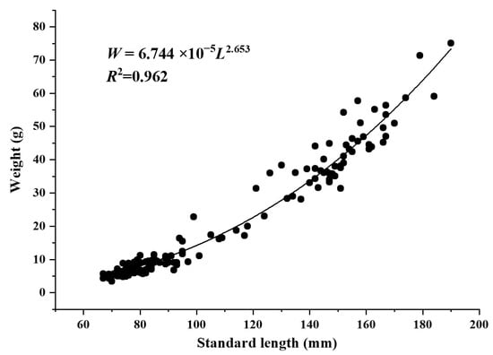 The relationship between the standard length and weight of the total samples was determined using the following power function formula: W = 6.744 × 10−5 L2.653 (R2 = 0.962, n = 150) (Figure 5). The growth index (b) and the expected value 3 were compared using a t-test, indicating that the growth of E. davidi was negative allometric (t = 8.000, p < 0.05).