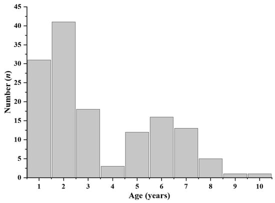 Out of 150 specimens, age was successfully identified for 141. They were categorized into 10 age groups, i.e., 1–10 years. The dominant age groups were 1 and 2 years, accounting for 20.6% and 27.3% of the total specimens, respectively, followed by 3 and 6 years, accounting for 12% and 10.7%, respectively. The ages of 5 and 7 accounted for 8.5% and 9.2%, respectively. There were very few individuals with ages of 4, 8, 9, and 10 years (Figure 6). The number of samples, standard length, and weight of different age groups are depicted in Table 3.