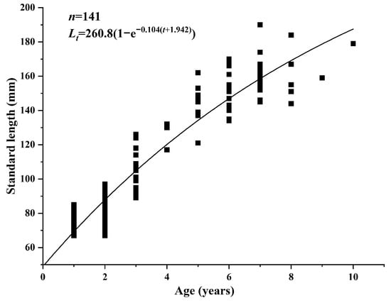 The growth parameters were calculated using the von Bertalanffy growth equation [], , , where t is the age of the fish, Lt and Wt are the standard length (mm) and weight (g), respectively, L∞ and W∞ are the theoretical maximum length (mm) and weight (g), respectively, k is the growth coefficient, and t0 is the hypothetical age at length 0. The growth inflection point was calculated by the equation t = lnb/k + t0. The growth performance index was calculated using the equation of Munro and Pauly [] as Ø = log10 k + 2 log10 L∞; Ø was used to compare the growth parameters obtained in this study with those reported by other Sisoridae fishes.