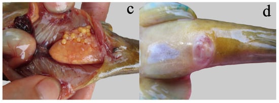 Gonad development (mature stage) and secondary sex character of E. davidi ((a): mature testis, (b): genital papilla, (c): mature ovary, (d): abdominal protrusion).