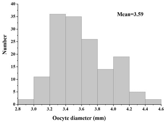 Measurement of the oocyte diameter of randomly selected females displayed a single-peaked distribution (Figure 9). The oocyte diameters were distributed between 2.87 and 4.51 mm (with an average of 3.59 mm) and concentrated at 3.2–3.8 mm, accounting for 64.67%.