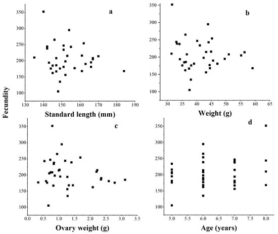Relationships between the standard length (a), weight (b), ovary weight (c), age (d), and fecundity of E. davidi.