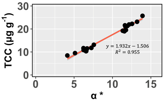 Correlation between different color values (a*) and total carotenoid content (TCC) in the abalone foot muscle. Each dot represents an individual abalone.