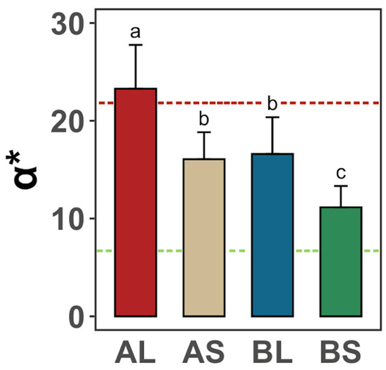 Comparison of foot-muscle color-difference values (a*) for F1 offspring abalones in groups AL, AS, BL, and BS. The red dashed line indicates the initial a* value of Group A, and the green dashed line represents the initial a* value of Group B. Different letters signify significant differences between groups (p < 0.05).