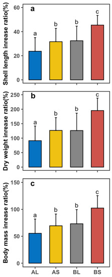 Comparison of shell length, weight and fatness gain ratio of abalone in 4 groups (mean ± SD, n = 20). (a) Shell length increase ratio; (b) Dry weight increase ratio; (c) Body mass increase ratio. Means with different letters are significantly different (p < 0.05).