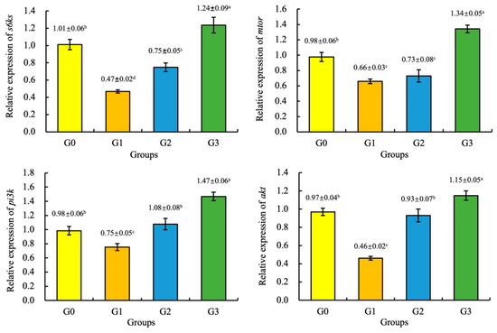 Compared with the G0 (control group), the expression of the mtor, akt, pi3k, and s6ks genes of the juvenile coho salmon fed the G3 diet were significantly increased (p < 0.05), and the expression of the mtor and s6ks genes of the juvenile coho salmon fed the G1 and G2 diets, and the expression of the akt and pi3k genes of the juvenile coho salmon fed the G1 diet were significantly decreased (p < 0.05). However, there were no significant differences in the expression of the akt and pi3k genes of the juvenile coho salmon fed the G2 and G0 diets (p > 0.05), as shown in Figure 1.