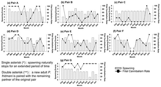 The number of spawning events and the filial cannibalism rate (%) of seven broodstock pairs (a–g) of Pseudochromis fridmani recorded each month over one year (February 2020 to January 2021).