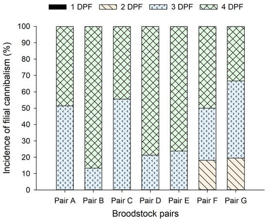 Overall, filial cannibalism most commonly occurred on day 3 or 4 post fertilization (DPF; Figure 2). The pooled data of all pairs showed that on 2 DPF, incidence of filial cannibalism was only 5 ± 9%, but it increased sharply to 35 ± 17%, and 60 ± 20% on 3 and 4 DPF, respectively. Notably, among the seven pairs, only pairs F and G were found sometimes cannibalizing their eggs on 2 DPF. The incidence of filial cannibalism on 3 and 4 DPF was relatively even for pair A and C, while for pairs B, D, and E, filial cannibalism predominately occurred on 4 DPF (Figure 2).