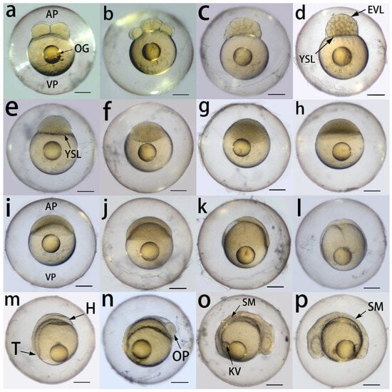 Embryonic development of Pseudochromis fridmani from 1 to 22 h post fertilization (PF) at 27 ± 1 °C. (a) The 4-cell stage (1 h PF); (b) 16-cell stage (1 h 30 min PF); (c) 64-cell stage (2 h PF); (d) 512-cell stage (3 h PF); (e) high stage (4 h PF); (f) oblong stage (5 h PF); (g) between oblong and sphere stage (7 h PF); (h) sphere stage (8 h PF); (i) dome stage, beginning of epiboly (9 h PF); (j) 30% epiboly (10 h PF); (k) 60% epiboly (12 h PF); (l) 90% epiboly (14 h PF); (m) bud stage, blastoderm completely covers the yolk (16 h PF); (n) optic primordium appears in the prospective head region (18 h PF); (o) 6-somite stage, Kupffer’s vesicle appears at the base of the prospective tail region (20 h PF); (p) 10-somite stage (22 h PF). AP, animal pole; EVL, enveloping layer; H, prospective head region; KV, Kupffer’s vesicle; OG, oil globule; OP, optic primordium; SM, somite; T, prospective tail region; VP, vegetal pole; YSL, yolk syncytial layer. The scale bar at the bottom right corner in each figure represents 200 μm.