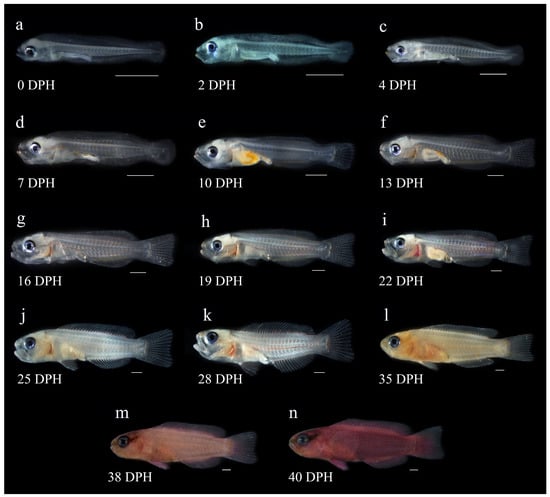 Larval development of Pseudochromis fridmani from newly hatched larvae to juveniles (i.e., from 0 to 40 days post hatching, DPH). (a) 0-DPH larva with fin folds and a straight-tube gut, with most of the yolk sac absorbed; (b) 2-DPH larva; (c) 4-DPH larva with rotifers in the gut and the developing gill filaments behind the operculum; (d) 7-DPH larva, showing the development of an intestinal loop and the beginning of notochord flexion; (e) 10-DPH larva with a gut full of Artemia nauplii and caudal fin ray development showing the completion of flexion; (f) 13-DPH larva with well-developed caudal fin; (g) 16-DPH larva; (h) 19-DPH larva, showing most fins are well developed; (i) 22 DPH larva; (j) 25 DPH larva with tiny dots of pink pigmentation on the body; (k) 28-DPH larva with more small patches of pink pigmentation on the body; (l) 35-DPH larva; note that the larva becomes less transparent with increased pigmentation developed on the body; (m) 38-DPH larva undergoing pigmentation development on the body with visible melanophores around the eye; (n) 40-DPH juvenile with adult-type pigmentation pattern. The scale bar at the bottom right corner in each figure represents 1 mm.