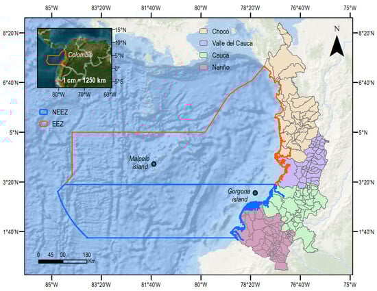 The study area corresponds to the Colombian South Pacific region, including the departments of Nariño and Cauca (Figure 1). This study area has been named the Nariño Economic Exclusive Zone (NEEZ) for the purpose of this study based on the area where the artisanal fishermen of Nariño carry out their fishing tasks. The Colombian Pacific has an Economic Exclusive Zone (EEZ) of 339,500 km2 and a coastline that extends from the borders of Panama (7°13′21″ N, 77°53′25″ W) to Ecuador (1°27′48″ N, 78°51′43″ W) [,]. Its continental shelf encompasses almost five traditional fishing grounds where different types of species can be found (straddling stocks, whitefish stocks, and demersal species) that are harvested by industrial and small-scale fisheries [].
