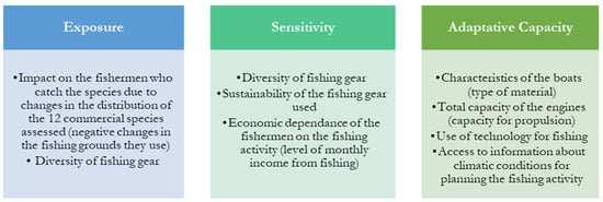 In the context of fisheries, exposure means the presence of people, lifestyles, species, ecosystems, ecosystem functions, services, resources, infrastructure, or cultural, economic, or social assets or goods in places and configurations that may be negatively affected by climate change []. On the other hand, sensitivity is related to how vulnerable the object or subject of study is. It shows how much a system responds to climatic influences and how climate changes may change its current form []. It can be thought of as the degree to which the fisheries sector will be affected by shocks and stresses due to its susceptibility. Adaptive capacity, finally, refers to the ability of individuals to respond to, cope with, and recover from the effects of changes or stressors. A system can adjust to climate change, including climate variability and extremes, in a way that minimizes damage, takes advantage of opportunities, or faces the consequences []. In this case, it is related to changes in the availability of biological resources and to the impact that fishing sector equipment, boats, and homes may have due to extreme events.