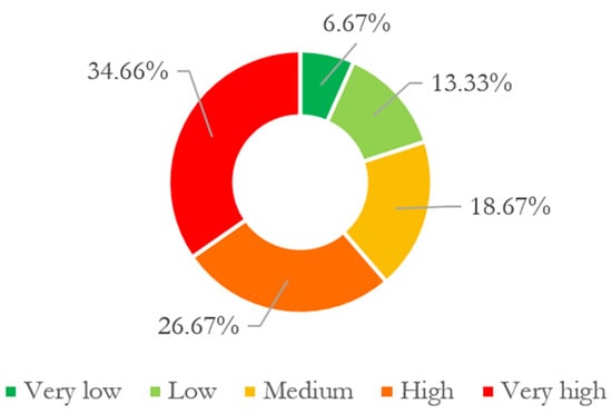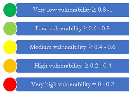 After scoring all the answers from the variables in the model for each fisherman, an average score was calculated for each component to obtain a general vulnerability score. These scores were then categorized into five levels of vulnerability (Figure 4).
