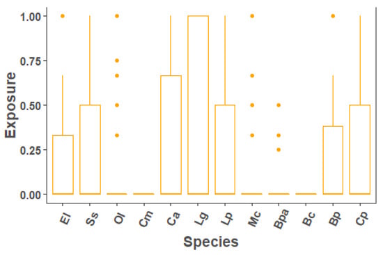 Scores of exposures of the fishing sites for each species assessed (species acronyms in Table 2).