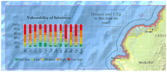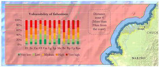 In the last category of sites located over 20 km from the coast, the high vulnerability of the fishermen decreased to 84%. This area includes traditional fishing grounds such as “Banco Tumaco”, “Banco Pasacaballos”, “Boya de Tsunami”, Gorgona Island, and “Banco la República”. The vulnerability associated with the species these fishermen catch is also reduced for several of the 12 species assessed. However, the black skipjack (El) and the Pacific bearded brotula (Bc) continue to pose a high level of vulnerability to the fishermen who catch them (Figure 10).