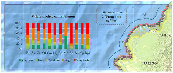 For the first category of distance—sites located within 3 km of the coastline—over 80% of the fishermen have a high to medium level of vulnerability. In this area, the most common fishing sites used by the surveyed fishermen are Salahonda, Tumaco Bay, Francisco Pizarro, “Barco Hundido” (sunken boat), and river estuaries. When analyzed by the species they catch, the Pacific bearded brotula (Bc), the black skipjack (El), and the cachema weakfish (Cp) presented the highest proportions of vulnerability among the fishermen (Figure 7). Based on projections of their future geographical distribution, these species will not be available in this coastal area. The species that would represent the least vulnerability for fishermen who carry out their tasks in this distance range would be the Pacific thread herring (Ol), the Pacific anchoveta (Cm), and the flathead grey mullet (Mc).