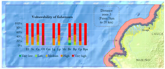 For the third category of distance (fishing sites between 5 km and 20 km of the coastline), the high vulnerability of the fishermen increases to 96%. This area includes the fishing sites “Avión Hundido” (Sunken Plane) and “Ancla Hundida” (Sunken Anchor), which are commonly used by the small-scale fishers of the region. The vulnerability associated with the species they catch shows that 2 of the 12 are not caught in this area. In contrast, the vulnerability of the fishermen who catch the threaded herring, the Chilhuil sea catfish (Bpa), the spotted rose snapper (Lg), the black skipjack (El), and the seerfish (Ss) in this area is increased (Figure 9).