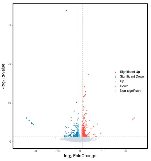 Volcano plots of DEGs from Astragalus membranaceus group and control group. The x-axis and y-axis represent fold change and −log10q-value, respectively. In volcano plot, red dots, blue dots, and grey dots represent significant upregulated, significant downregulated, and non-significant different unigenes, respectively.