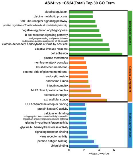 Spleen DEGs in the A. membranaceus group were significantly enriched (p < 0.05) in 173 GO terms. The five most significantly enriched biological process (BP) items included “cell adhesion”, “adaptive immune response”, “clathrin-dependent endocytosis of virus by the host cell”, “antigen processing and presentation of endogenous peptide antigen via MHC class Ib”, and “B cell receptor signaling pathway.” The five most significantly enriched cellular component (CC) items included “extracellular space”, “extracellular region”, “MHC class I protein complex”, “integrin complex”, and “endosome lumen”. The significantly enriched five top molecular function (MF) items were “virion binding”, “peptide antigen binding”, “virus receptor activity”, “signaling receptor binding”, and “glycine n-benzoyl transferase activity” (Figure 2). The results revealed substantial immune changes in A. membranaceus-fed fish when stimulated with A. hydrophila.
