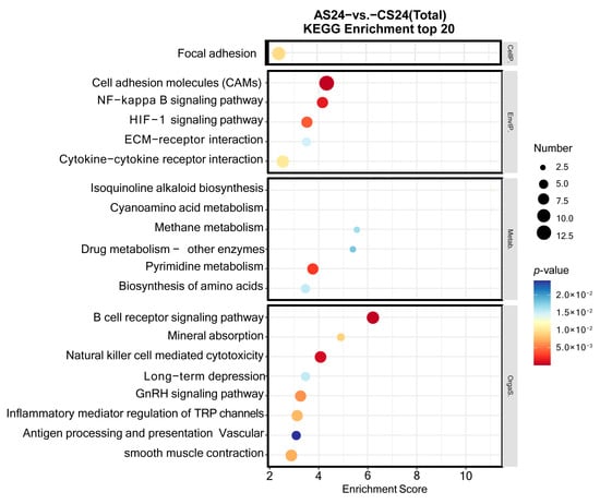 The top 20 KEGG pathways were cell adhesion molecules, the B cell receptor signaling pathway, natural killer cell-mediated cytotoxicity, the NF-kappa B signaling pathway, antigen processing and presentation, pyrimidine metabolism, focal adhesion, and inflammatory mediator regulation of TRP channels (Figure 3).