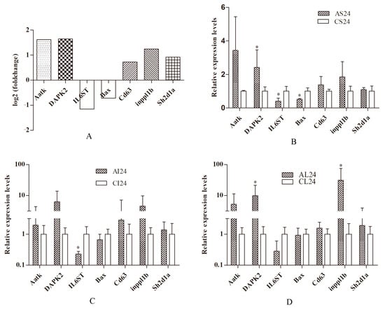 RNA-seq and qRTPCR of seven immune-related genes. (A) The fold change of five upregulated and two downregulated immune-related genes between the Astragalus membranaceus and control groups by RNA-Seq. (B) Expression of spleen qRTPCR. (C) Expression of intestine qRTPCR. (D) Expression of liver qRTPCR. * indicates a significant difference between the A. membranaceus group and the control group (p < 0.05).
