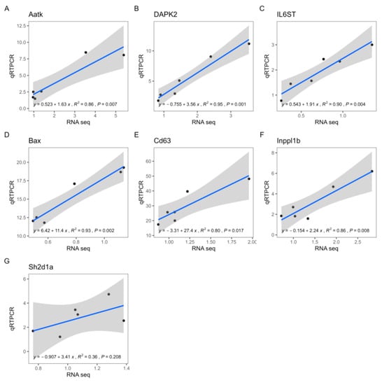 In this study, a correlation analysis between the RNA-Seq data and qRTPCR results for the seven DEGS in the spleen was performed using cor() in the R environment. R2 was 0.86, 0.95, 0.90, 0.93, 0.80, 0.86, 0.36 in Aatk, DAPK2, IL6ST, Bax, Cd63, Inppl1b, and Sh2d1a. All seven DEGs in the spleen showed the same linear correlation between qRTPCR and RNA-seq. Correlation analysis revealed that qRTPCR and RNA-seq showed a significant trend (p < 0.05) for Aatk, DAPK2, IL6ST, Bax, Cd63, and Inppl1b (Figure 5).