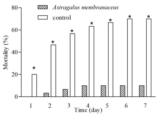 Mortality of hybrid yellow catfish. Time indicates the day that fish have been challenged with Aeromonas hydrophila. Mortality = cumulative mortality. * indicates a significant difference between the Astragalus membranaceus group and the control group (p < 0.05).