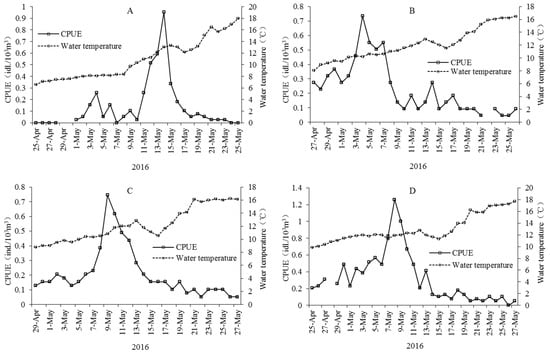 The everyday CPUE (number of fish·10−3 m3) for the chum salmon sampled at the Jiaxinzi station of the Amur River (A) and the Hutou (B), Raohe (C), and Haiqing (D) stations of the Ussuri River from late April to late May (solid line) in 2016. The dotted line represents the water temperature (°C).
