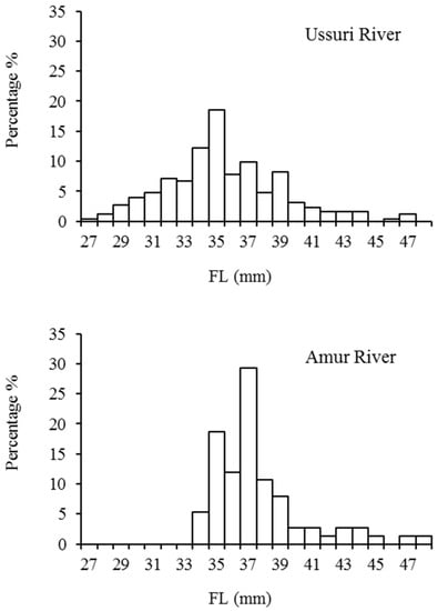 Frequency distribution of fork length for the Amur River and Ussuri River samples. The fork length groups were determined using 1 mm sections. The samples from the Amur River mainly occupied the 35–38 mm groups, with a value of 70.7%; meanwhile, for the Ussuri River, the samples fell into the 34–37 mm groups, representing 48.4%.