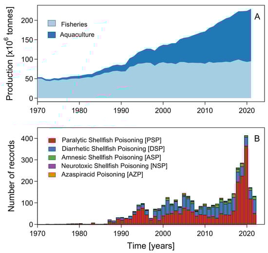(A) World fisheries’ catches and aquaculture production, and (B) number of global records of the five most common toxic HAB syndromes (PSP, DSP, ASP, NSP and AZP). Data are from FAO (https://www.fao.org) and the IOC HAEDAT (http://haedat.iode.org/).