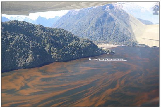 In order to prevent the risks of human exposure to potent marine toxins, many countries have been implementing specific health and safety measures. Mardones et al. [10] estimated that the cost of microalgae and toxin monitoring on the Chilean coast was USD 6.9 million in 2019. This country, the world’s second largest producer of cultured blue mussels (Mytilus chilensis) and salmon (mainly Salmo salar and Oncorhynchus kisutch) with 400,000 and 1,000,000 tons per year, respectively, has been severely affected by HABs events in the last decade [11,12,13]. In summer 2016, a major HAB event in Southern Chile of the fish-killer Pseudochattonella verruculosa generated losses of USD 800 million [14]. This event, the world’s largest-ever recorded farmed-fish mortality, caused a severe economic and social crisis in the region. Five years later, a bloom of Heterosigma akashiwo generated a new massive salmon mortality in Comau Fjord, Chilean Patagonia [15]. During that event, high cell densities (>2 · 105 cells mL−1) discolored the sea surface waters with intense brown patches visible to the naked eye (Figure 2).
