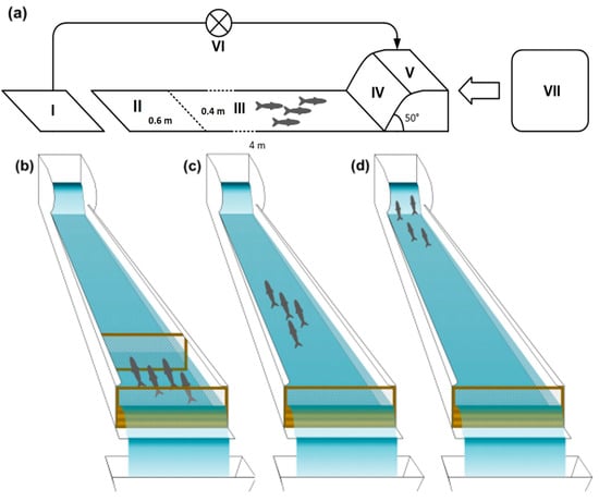 Scheme of the experimental set-up in the mesocosm facility. (a) Sections composing each flume channel, operating in a recirculating system: I—downstream tank; II—acclimation section; III—flume channel; IV—ramp; V upstream tank; VI—pump Kripsol OK-71 B, 0.56 kW; VII—holding tank. (b) Acclimation phase lasting 10 min, with fish being kept in the lowermost section of each channel delimited upstream by a net; (c) free movement of the fish during 1 h trials, with one observer per channel; (d) attempts to negotiate the ramp (boldness).