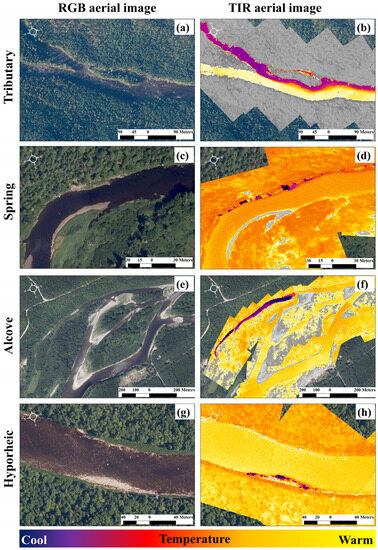 Illustrations of four thermal refuge classes, where the red–green–blue (RGB) aerial image is paired with a corresponding thermal infrared (TIR) image. A tributary confluence thermal refuge is shown in (a,b), where the influence of the tributary is > 200 m in the main river. Panels (c,d) display a groundwater spring refuge, where the influence of the spring has a markedly small footprint. An alcove thermal refuge is presented in (e,f). These areas can be groundwater dominant and have low dissolved oxygen values and can also be disconnected from the main river during low flow. The last thermal refuge class is the hyporheic discharge refuge (g,h). These present as very fine-scale discharges and are likely to be the least energetically favorable thermal refuges for salmonids due to the hydrological processes that govern their presence [35]. The example images are from the Miramichi River, NB, Canada.
