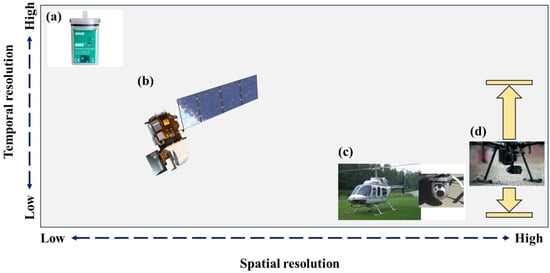 A schematic depicting both the temporal and spatial scale that different temperature sensors can capture. Different spatio-temporal resolution combinations of water temperature are achieved by using temperature loggers (a), satellites (b) and manned- (c) and unmanned (d) airborne thermal infrared imagers. The use of these sensors is discussed in depth in the main text.
