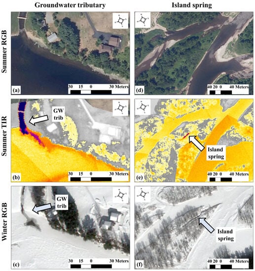 In frozen environments, discrete groundwater (GW) discharges (dependent upon the depth the groundwater is sourced from [68]) can remain free-flowing during iced-over conditions. This is detailed for a groundwater tributary in panels (a–c) and for an island spring in panels (d–f), where the thermal images (b,e) reflect the summer conditions, and the high-resolution satellite images (Worldview 3) reflect the winter conditions (c,f).