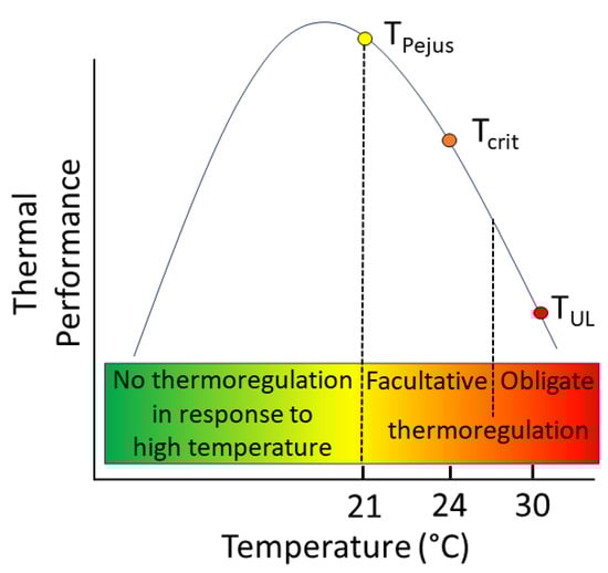 Contrastingly, obligate behavioural thermoregulation occurs at some time (but not necessarily at a crisp “threshold”) when the ambient water temperature exceeds TCrit. As the water temperature continues to rise, and anaerobic metabolism produces accumulating concentrations of by-products (e.g., lactate) in fishes’ bodies, causing stream salmonids to enter a mode of obligate behavioural thermoregulation; a phenomenon that is necessary for the animal to avoid imminent death (Figure 4). As the metabolic by-products start to accumulate at an accelerating rate when the water temperatures exceed TCrit, the timing of the initiation of obligatory thermoregulation occurs at some temperature around TCrit but, supported by observations in field, well in advance of the ultimate lethal temperature (TUL), i.e., the temperature that fish cannot tolerate for more than 10 min [70]. Obligate behavioural thermoregulation continues under all water temperatures exceeding the initial trigger temperature (Figure 4).