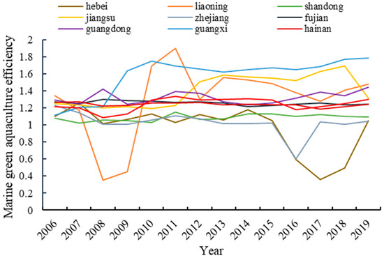 From 2006 to 2019, the efficiency of marine green aquaculture in nine coastal provinces in China fluctuated between 0.35 and 1.91. From the overall average point of view, the efficiency of marine green aquaculture in China showed a fluctuating upward trend of first decreasing, then rising, and then decreasing again, with a fluctuation range of (1.08, 1.34), which still has large room for improvement. In 2016, except in Hebei and Liaoning, the efficiency value of marine green aquaculture in other provinces was above 1, and in 2019, the efficiency value of marine green aquaculture in all provinces was above 1. Therefore, there are great differences in the efficiency of marine green aquaculture in time and space.