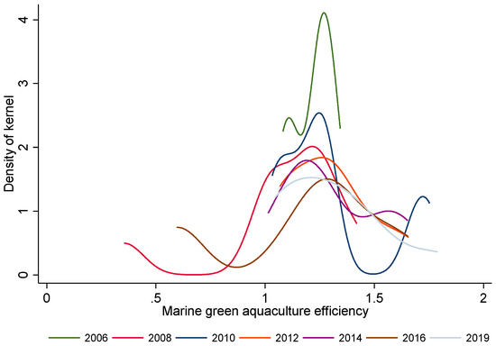 Kernel density plot of seawater green aquaculture efficiency in China from 2006 to 2019.