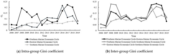 Intra-group and inter-group Gini coefficient changes of marine green aquaculture efficiency in each marine economic zone from 2006 to 2019.