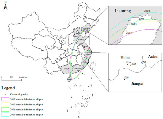 This research measured the center of gravity and standard deviation ellipse of marine green aquaculture efficiency in our country by using the ArcGIS10.8 software. By analyzing the center of gravity of marine green aquaculture efficiency and its changing trajectory, the changing direction of efficiency space can be determined. By analyzing the direction of the major semi-axis of the standard deviation ellipse, we can understand the main distribution direction of the marine green aquaculture efficiency, and by analyzing the direction of the short semi-axis of the standard deviation ellipse, we can understand the main distribution range of the marine green aquaculture efficiency. By analyzing the change in rotation angle, we can understand the change in the main direction of marine green aquaculture efficiency. By analyzing the area of the standard deviation ellipse and its change, the development trend of marine green aquaculture efficiency can be judged. The relevant parameters of the spatial distribution center of gravity and standard deviation ellipse of marine green aquaculture efficiency are shown in Table 4, and the evolution diagram of the spatial pattern of marine green aquaculture efficiency in China in 2006, 2010, 2015, and 2019 was drawn, as shown in Figure 4.