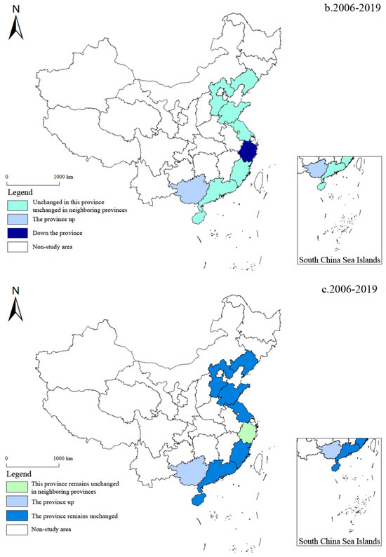 From Figure 5, it can be seen that from 2006 to 2019, there is one province with its own province rising and its neighboring provinces unchanged (Guangxi), one province with its own province falling and its neighboring provinces unchanged (Zhejiang), and seven provinces with their own province rising and their neighboring provinces unchanged (Liaoning, Hebei, Shandong, Jiangsu, Fujian, Guangdong, and Hainan). There is no such thing as one province going up and one neighboring province going up and one province going down and one neighboring province going down. To sum up, the correlation effect of marine green aquaculture efficiency in China is generally good, and most provinces are in a constant or upward transfer state; only Zhejiang Province has a backward trend of downward transfer. The possible reasons are that the proportion of fish farming in the economy of Zhejiang Province is still large [52], and the growth mode of extensive fisheries is still dominant, which leads to the downward transfer of the efficiency of marine green aquaculture in Zhejiang Province.