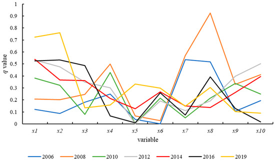 As can be seen from Figure 6, during 2006–2019, the q values of the number of professional mariculture practitioners (x1), the number of aquatic technology extension institutions (x2), the number of seawater seedlings (x5), and the output value of mariculture (x6) showed an increasing trend, and the increasing degree was in the following order from large to small: x2 (67.387%), x1 (60.310%), x6 (29.820%), and x5 (29.323%). The q values of other driving factors showed a decreasing trend, and the decreasing degree was as follows: x7 (−39.035%), x8 (−21.523%), x10 (−10.415%), x4 (−8.963%), x3 (−4.628%), and x9 (−0.304%). This indicates that the explanatory power of the number of mariculture professionals (x1), the number of aquatic technology extension institutions (x2), the number of seawater seedlings (x5), and the output value of mariculture (x6) is increasing. At the end of the year, the explanatory power of mariculture motor fishing vessels (production fishing vessels) (x3), mariculture area (x4), per capita disposable income of fishermen (x7), mariculture output (x8), technical training number of fishermen (x9), and carbon sequestration capacity (x10) continued to decline.