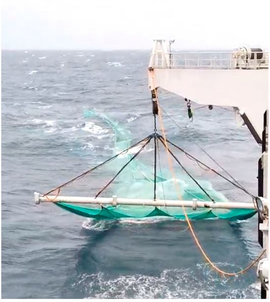 The Antarctic krill is a smaller mesopelagic species with a lower swimming speed [6]; therefore, the midwater trawl is the primary fishing gear used for catching this species. Many scholars have conducted research on the design and optimization of the midwater trawl for Antarctic krill. For example, Wan et al. [2] designed a large Antarctic krill trawl with good hydrodynamic performance, enabling efficient krill harvesting. Feng et al. [7] investigated the impacts of different structural parameters on the Antarctic krill trawl and provided optimization recommendations. Nsangue et al. [6] studied the effects of flow velocity, horizontal expansion ratio, sinker weight, buoyancy, and other factors on the performance of the Antarctic krill trawl. Currently, Antarctic krill harvesting is primarily carried out using two main types: the traditional otter trawl and the innovative continuous pump suction-type beam trawl (Figure 1) [8,9]. Norwegian fishing vessels utilizing the continuous pump suction-type beam trawl achieved an average annual catch per vessel that was more than three times higher than traditional single-ship otter trawl fishing vessels [10]. Under the total catch quota management system implemented in the Antarctic krill fishery [11], the continuous pump suction-type beam trawl shows promising and widespread applications.