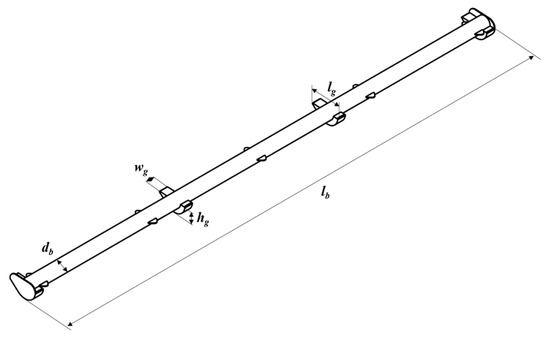 The prototype of the beam (Figure 3) in this study is used in the “Shen Lan” Antarctic krill beam trawler, with a power of 8000 kW and an operation towing speed of 1.5 to 3.5 kn. The principal segment of the beam takes the form of a cylindrical structure, measuring 18 m in length (lb) and 0.45 m in diameter (db). The beam is constructed from Q345 steel, with a wall thickness of 25 mm and weighing approximately 8 t. Semi-circular guides are symmetrically installed at both ends of the beam and the main section, being 1 m in length (lg), 0.3 m in width (wg), and 0.4 m in height (hg).