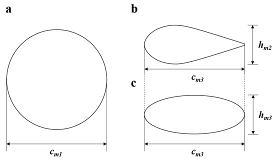To investigate the hydrodynamic performances of the beams with different shapes, the beams with airfoil and elliptical shapes are designed based on the prototype cylindrical beam (model 1). The three models maintain consistent chord lengths (c). The airfoil beam (model 2) employs the EPPLER 864 airfoil [21], characterized by a maximum thickness of 38.83% and a peak camber of 0.04%. Meanwhile, the elliptical beam (model 3) possesses a short axis length (height, h) identical to the maximum thickness (height, h) of the airfoil beam. The cross-sections of the three models are shown in Figure 4, and detailed parameters are outlined in Table 1.