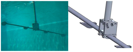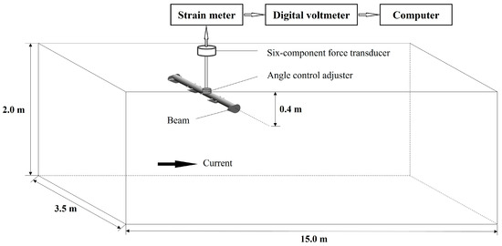 The hydrodynamic assessments of the model beams were carried out in a circulation flume at Shanghai Ocean University, boasting dimensions of 15.0 m in length, 3.5 m in width, and a water depth of 2.0 m. The flow velocity of the flume spanned the spectrum from 0 to 1.5 m/s, meticulously governed with a precision of 1% in water velocity control. The observation section of the flume was 6.0 m in length and 3.3 m in width. The model beams were positioned 3.0 m downstream from the flow entrance and upheld at a distance of 0.4 m from the water surface (Figure 5). A six-component force transducer (0–200 N) was employed during the experiment to measure the lift force (FL) and drag force (FD) on the model beams. An angle control adjuster (Figure 6) was installed at the junction between the beam and the force transducer, which was used to adjust the angle of attack (AOA) of the beams during the experiment (Figure 7). The preliminary experiments on the bracket were conducted to measure the hydrodynamic force of the clamps and the angle control adjuster under different working conditions. The data in this paper were the final results after removing the influence of the bracket. The AOA was systematically varied within the range of −60° to 60°, with increments of 15°. The water temperature remained at approximately 20 °C during the flume test.