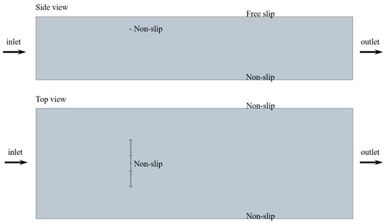 The computational domain, experimental arrangement, and setup for the CFD were of a comparable scale to the configurations that were examined in the flume tank experiments (Figure 5). The advection component of the velocity underwent spatial discretization using a high-resolution scheme within the CFX solver. In contrast, the treatment of turbulence-related factors, such as turbulent kinetic energy (k) and turbulent eddy dissipation (ε), was accomplished through the utilization of a 1st-order upwind scheme. The fluid was modeled as water, with a density (ρ) of 998.2 kg/m3 and a viscosity (μ) of 1.003 × 10−3 kg/(m·s). Further, the k and ε at the entrance of domain were calculated by following Xu et al. [29]. The current velocity was set at a uniform flow of 0.4 m/s (approximately 2.5 kn for the operation of full-scale trawls), of which the Reynolds number Re = 1.50 × 104. Since the fluid could discharge completely, the pressure outlet was designated as the outlet boundary, with a relative pressure of 0 Pa. Smooth walls with non-slip conditions were used on the otter board surfaces, the side surfaces, and the bottom surface of the domain, while free slip walls were set on the other walls (Figure 8).