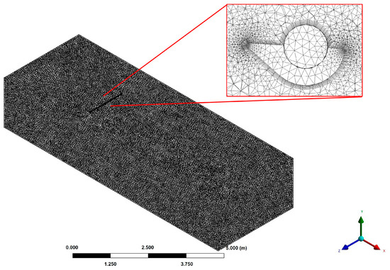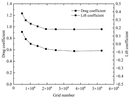 The unstructured tetrahedral grids were adopted in the far-field computational domain, and the near-wall region was refined with the 8-layer prismatic layers (Figure 9). The first layer thickness was 2.0 × 10−4 m to ensure y+ ≥ 15. Hence, the wall function was employed to handle near-wall interactions within the high-Re separation flow. Additionally, a mesh convergence test was executed to validate the accuracy of the numerical simulation, of which drag and lift force were selected as the target indices. As shown in Figure 10, both the lift coefficient and drag coefficient achieved stability when the grid count reached 2 million. The deviations of the drag and lift forces among the last three cases were less than 1%. Considering the balance of computational efficiency and accuracy, the total number of elements and nodes totaled approximately 2.52 × 106 and 5.17 × 105, respectively.