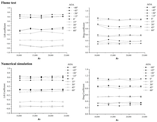 In order to verify the accuracy of the numerical simulation method selected in this study, a comparative study was conducted between the flume test and numerical simulations on the airfoil and cylindrical beams. The relationship between hydrodynamic coefficients (CL, CD) of the airfoil beam (model 2) and Re for each AOA are depicted in Figure 11. As shown in the figures, the CL and CD for the beam exhibited a tendency to stabilize when the flow velocity exceeded 0.36 m/s (Re > 1.35 × 105), and it was in the critical Re region [30] or the so-called self-modeling region [27]. Therefore, the CL and CD of the beams are discussed in the following sections with the flow velocity of 0.4 m/s (Re = 1.50 × 104).